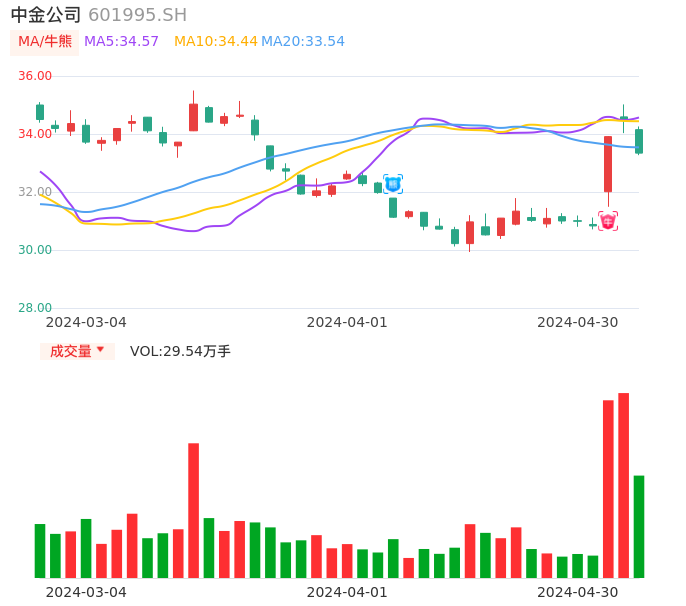 04月30日,中金公司收报33.34,股价涨幅-3.31%,成交金额9.96亿元,换手率1.01%。