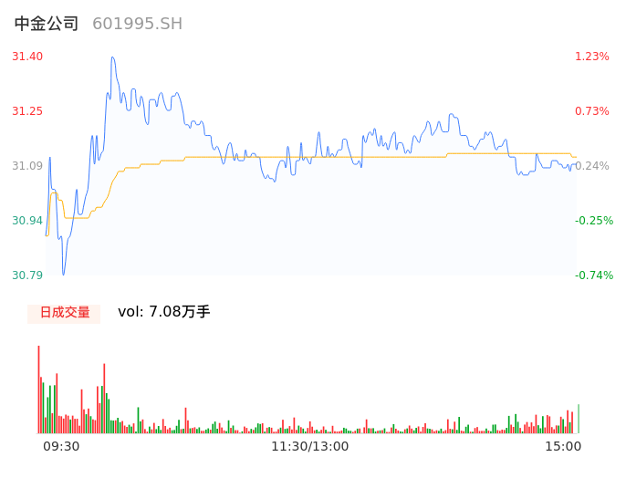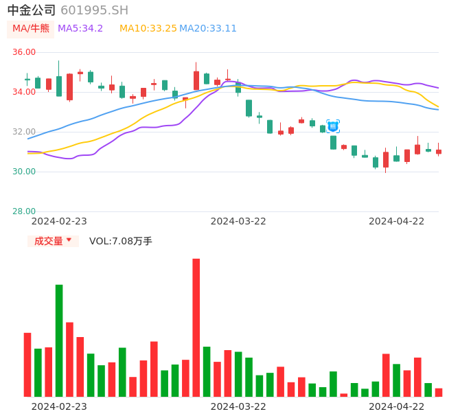 04月22日,中金公司收报31.09,股价涨幅0.23%,成交金额2.20亿元,换手率0.24%。