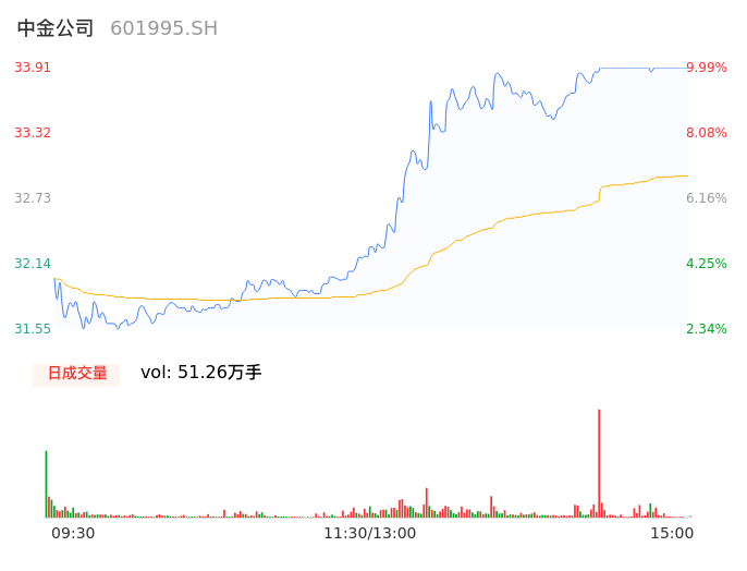 04月26日,中金公司收报33.91,股价涨幅9.99%,成交金额16.88亿元,换手率1.75%。