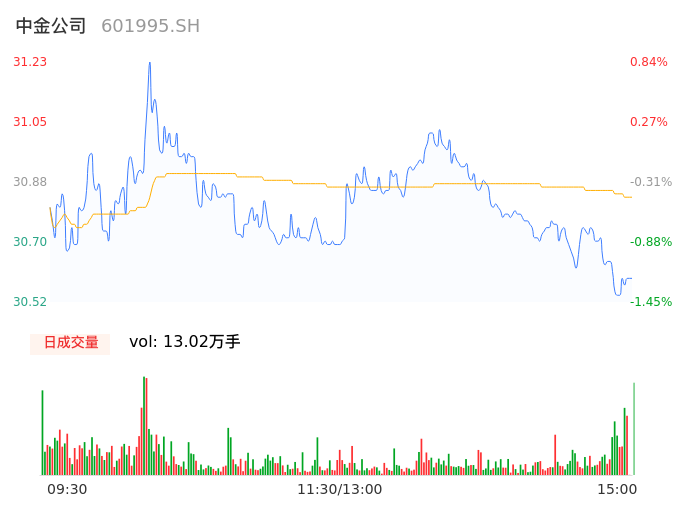 04月16日,中金公司收报30.52,股价涨幅-1.45%,成交金额4.01亿元,换手率0.45%。
