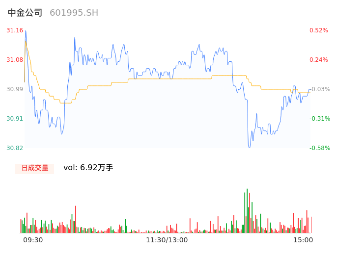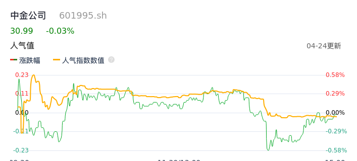 04月24日,中金公司收报30.99,股价涨幅-0.03%,成交金额2.15亿元,换手率0.24%。