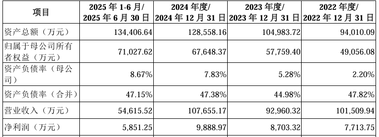财务方面,于2022年度、2023年度及2024年度及2025年1-6月,公司实现营业收入分别约为人民币10.15亿元、9.3亿元、10.77亿元、5.46亿元;同期,公司净利润分别为人民币7713.75万元、8703.32万元、9888.97万元、5851.25万元。
