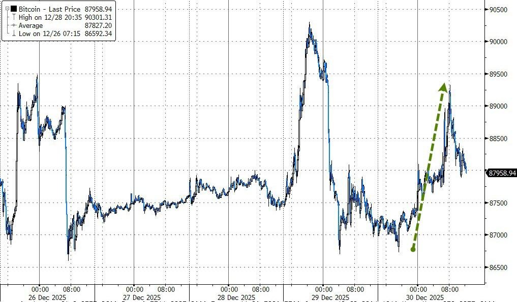 • 纽约尾盘,CME比特币期货BTC主力合约较周一纽约尾盘涨1.31%,报88710美元。