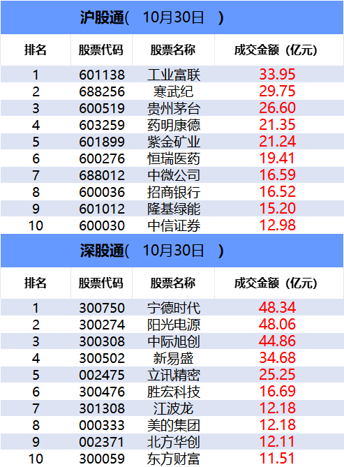 从沪股通前十大成交个股来看,工业富联位居首位;寒武纪和贵州茅台分居二、三位。