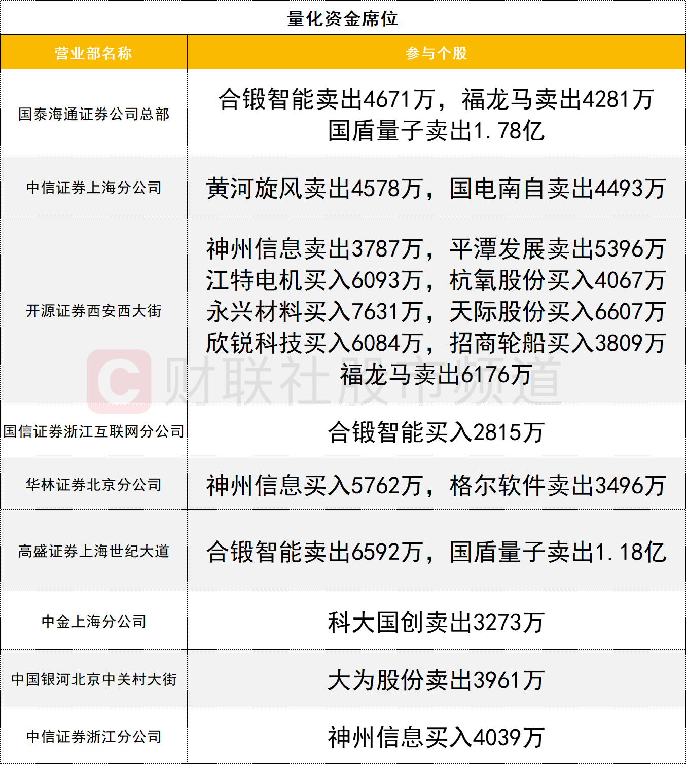 量化资金活跃度较高,科大国创遭中金公司上海分公司席位卖出3273万。国盾量子遭国泰海通证券公司总部和高盛上海世纪大道席位分别卖出1.78亿和1.18亿。