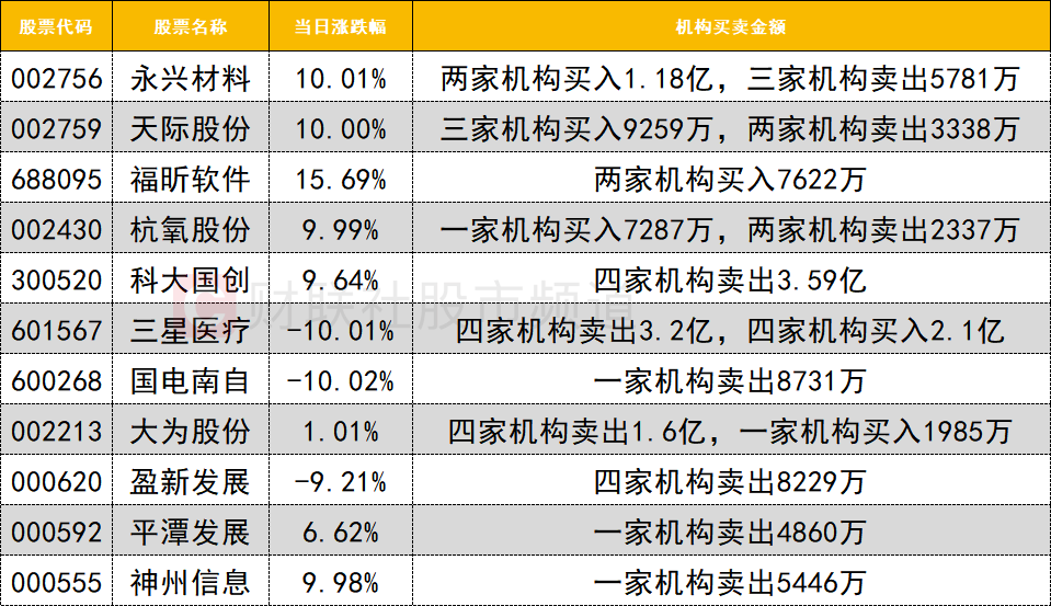 今日龙虎榜机构活跃度较高,买入方面,永兴材料今日涨停,获两家机构买入1.18亿,但同时遭三家机构卖出5781万。