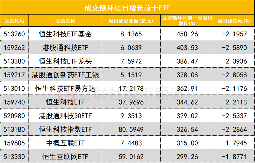 从成交额环比增长前十的ETF来看,恒生科技ETF基金(513260)成交额环比增长450%位居首位;港股通科技ETF(159262)成交额环比增长403%位居次席。