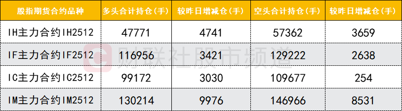 四大期指主力合约中,IH、IF、IC、IM合约多空双方均加仓,IH、IC、IM合约多头加仓数量较多。