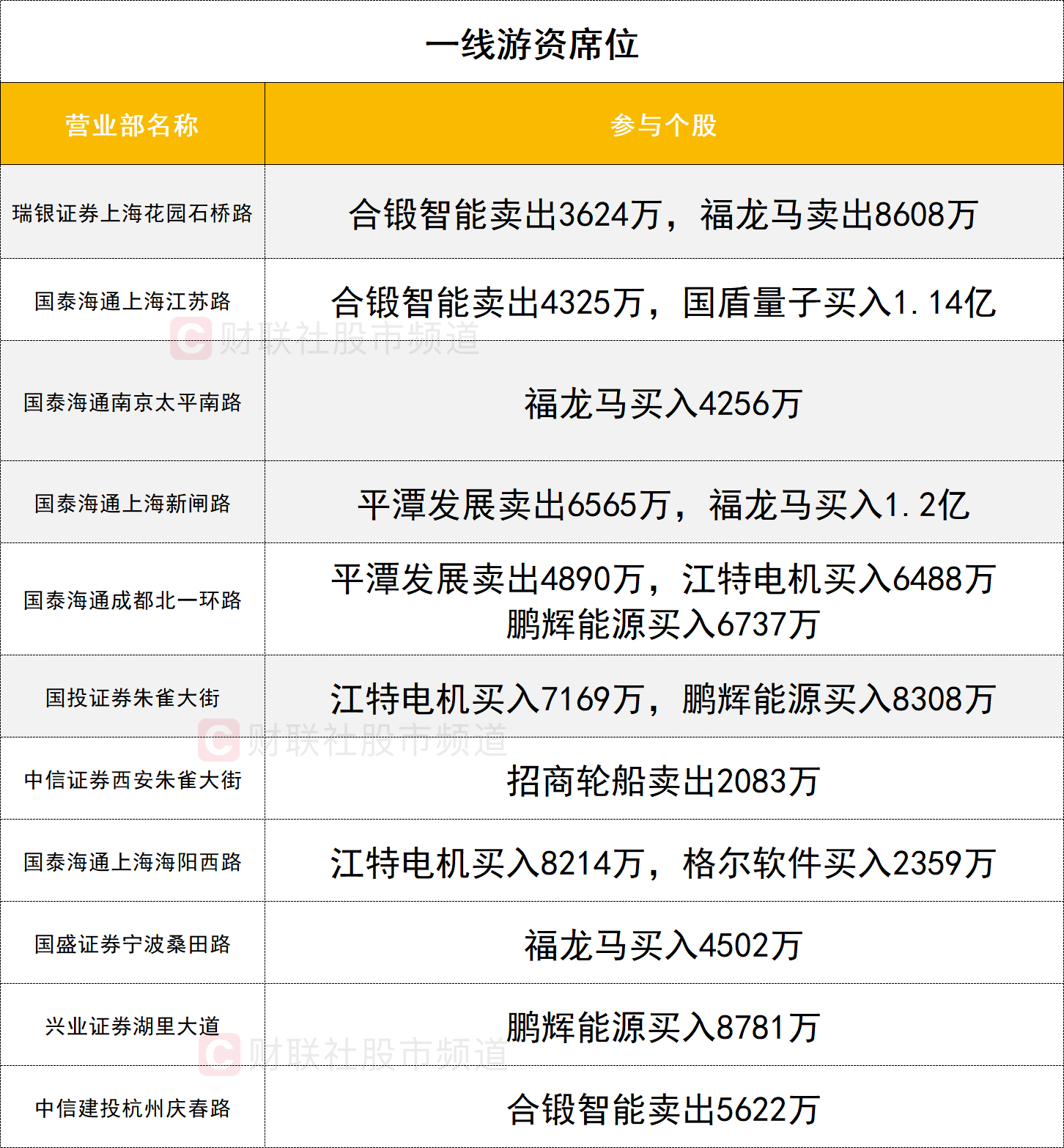 一线游资活跃度较高,合锻智能遭三家一线游资席位合计卖出1.3亿。鹏辉能源获三家一线游资席位合计买入2.3亿。