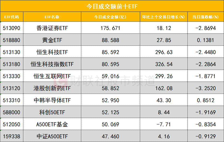从成交额前十的ETF来看,香港证券ETF(513090)成交额位居首位,黄金ETF(518880)成交额位居次席。