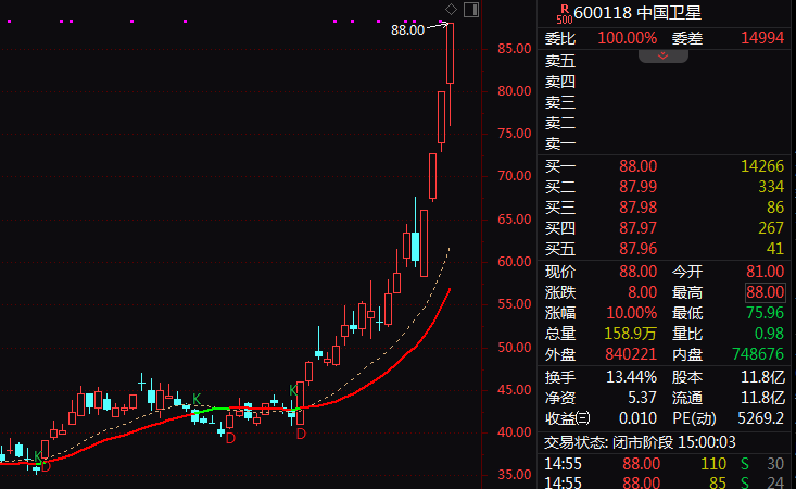 航天概念股继续强者恒强,板块指数大涨近5%,再创历史新高。中国卫星(600118)在收盘前最后不到10分钟封死涨停,连续第4日封板,股价创历史新高,今年以来大涨逾222%,市值超1000亿元,航天环宇也在临近收盘20%涨停,股价同样创历史新高,海格通信、航天发展等超20股涨停或涨超10%。