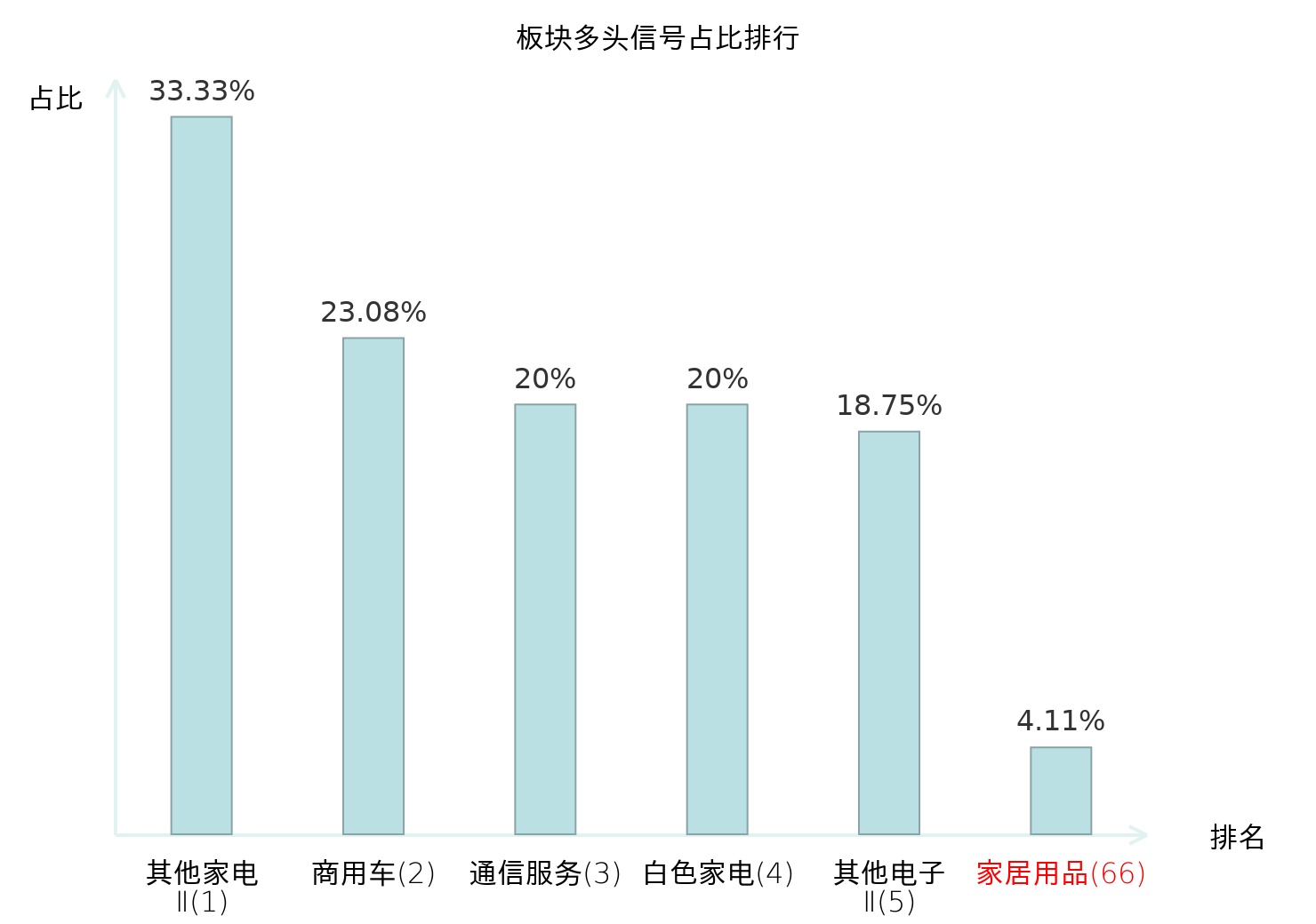 全市场所有行业板块中主力多头信号占比排名中,其他家电Ⅱ板块位居第一。其他家电Ⅱ板块名次提升最快,较昨日上升129位。