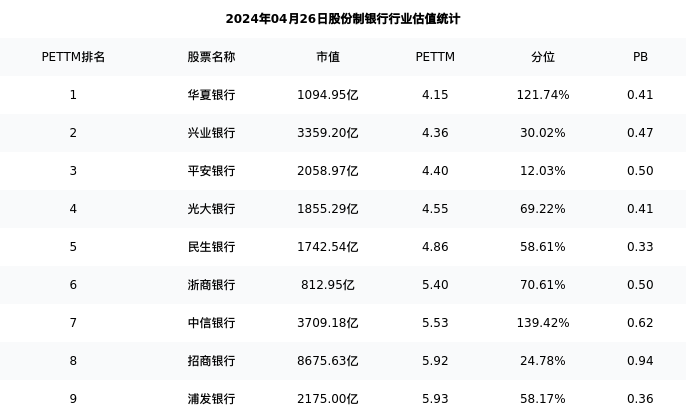 从估值角度看:中信银行最新市盈率PETTM为5.53,在行业内排名7/9,处于139.42分位。