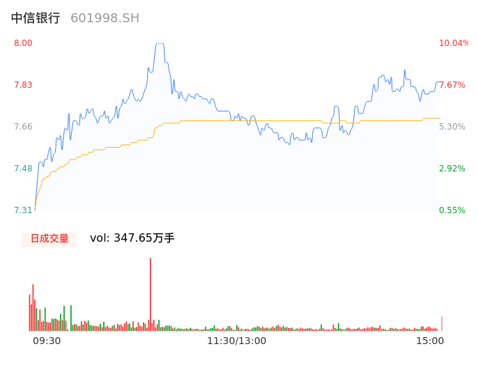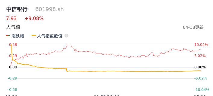04月18日,中信银行收报7.93,股价涨幅9.08%,成交金额26.82亿元,换手率0.91%。