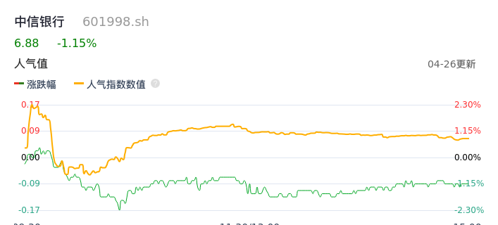 04月26日,中信银行收报6.88,股价涨幅-1.15%,成交金额5.09亿元,换手率0.19%。
