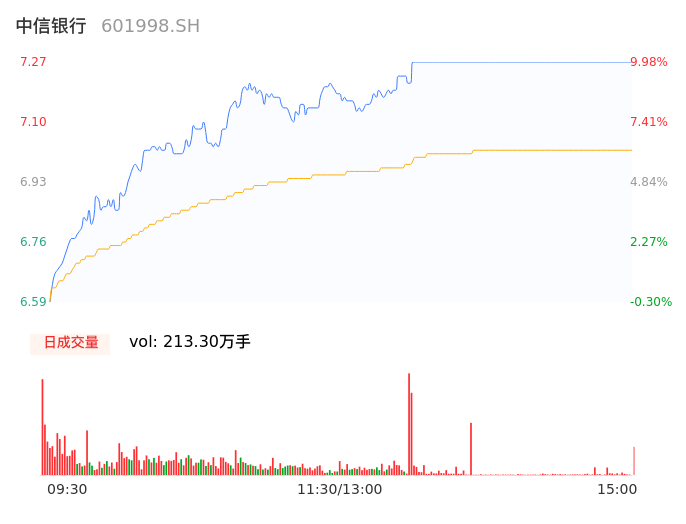 04月17日,中信银行收报7.27,股价涨幅9.98%,成交金额14.98亿元,换手率0.56%。
