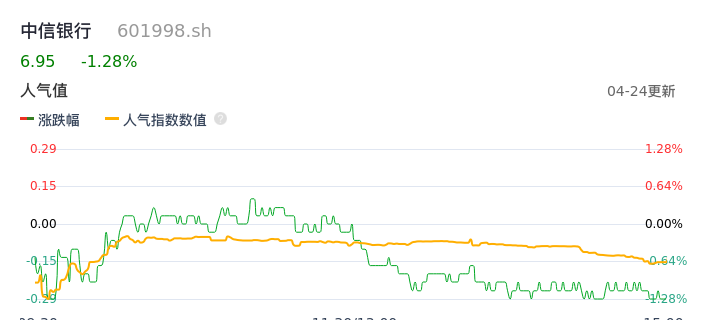 04月24日,中信银行收报6.95,股价涨幅-1.28%,成交金额5.03亿元,换手率0.19%。