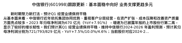 值得注意的是:2024年04月开源证券的刘呈祥分析师,首次发布关于中信银行的研究报告,标题为:中信银行(601998)跟踪更新:基本面稳中向好 业务支撑更趋多元。