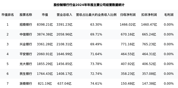 中信银行最新报告期数据为年报,下表汇总了股份制银行行业内市值靠前的公司年报主要经营数据