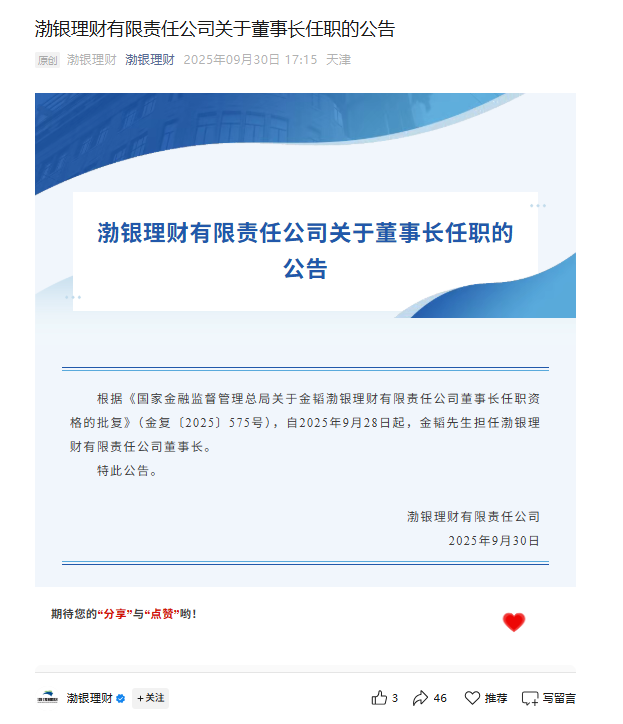 渤银理财今日公告显示,金韬正式获批担任公司董事长。监管批复显示,国家金融监督管理总局已于9月28日核准其任职资格。此次就任属于内部晋升,金韬此前担任该公司总裁一职。