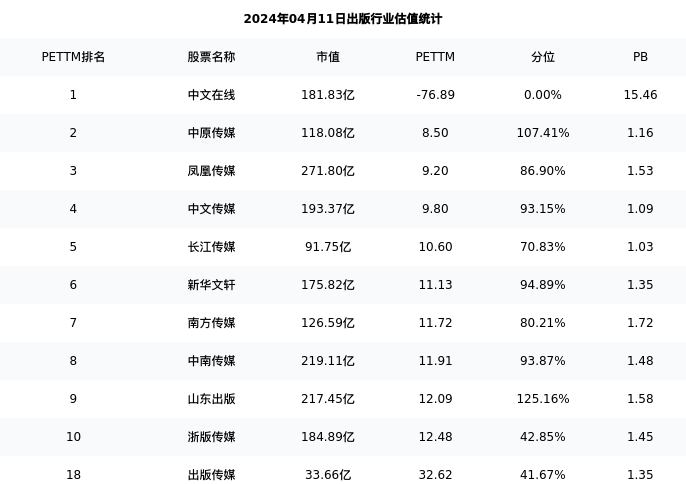 从估值角度看:出版传媒最新市盈率PETTM为32.62,在行业内排名17/29,处于41.67分位。