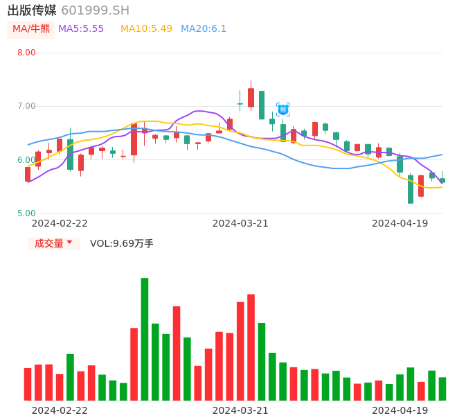 04月19日,出版传媒收报5.58,股价涨幅-1.41%,成交金额5487.28万元,换手率1.76%。