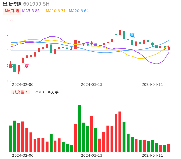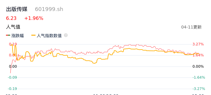 04月11日,出版传媒收报6.23,股价涨幅1.96%,成交金额5210.27万元,换手率1.52%。