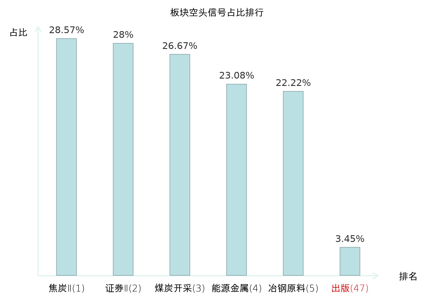 全市场所有行业板块中主力空头信号占比排名中,焦炭Ⅱ板块位居第一。煤炭开采板块名次提升最快,较昨日上升128位。