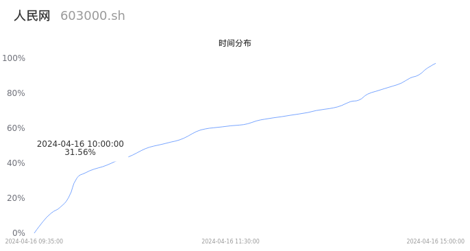 603000人民网2024年04月16日成交29.34万手,成交金额6.79亿元,相较昨日放量2.69万手,换手率2.65%,成交清淡。