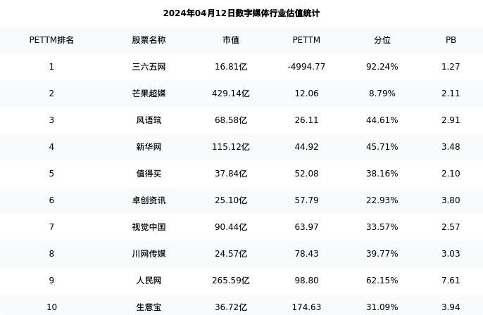 从估值角度看:人民网最新市盈率PETTM为98.80,在行业内排名8/13,处于62.15分位。