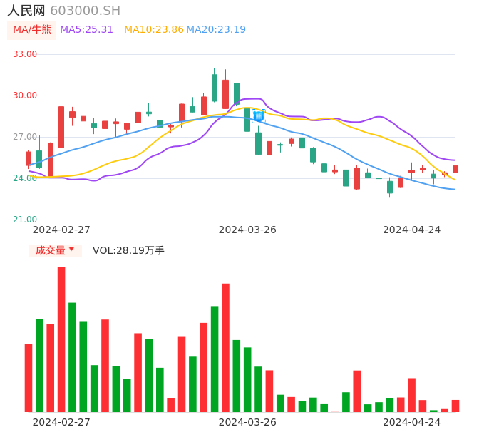 04月24日,人民网收报24.90,股价涨幅2.05%,成交金额6.95亿元,换手率2.55%。