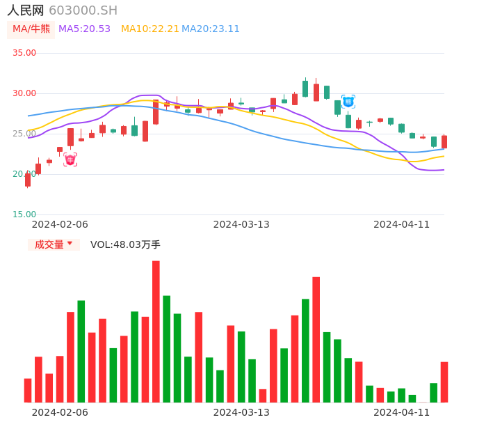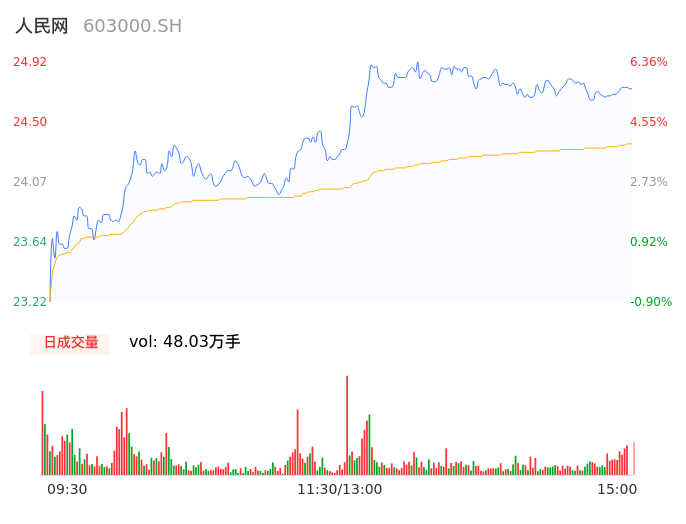 04月11日,人民网收报24.74,股价涨幅5.59%,成交金额11.69亿元,换手率4.34%。