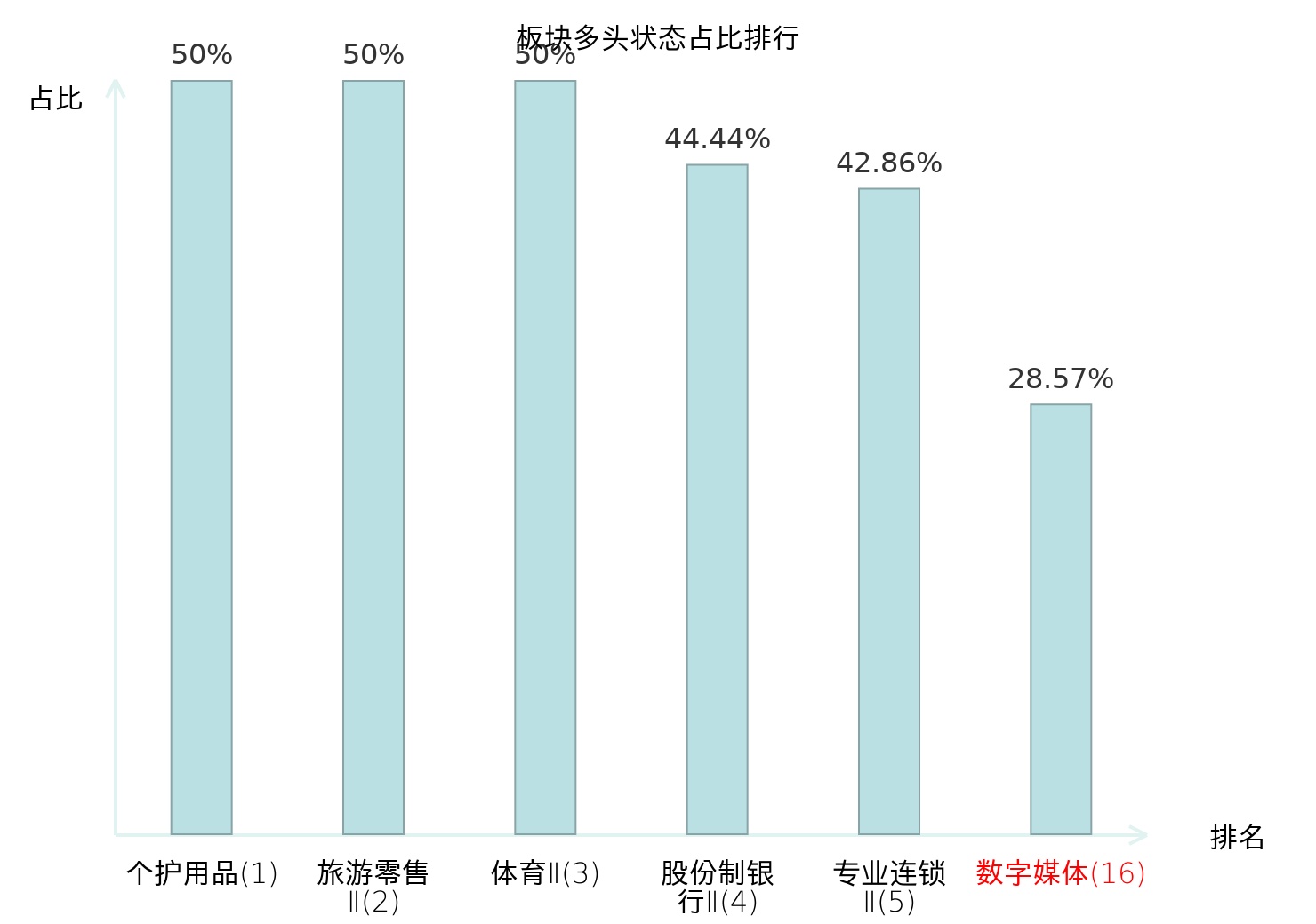 全市场所有行业板块中主力多头状态占比排名中,个护用品板块位居第一。非金属材料Ⅱ板块名次提升最快,较昨日上升37位。