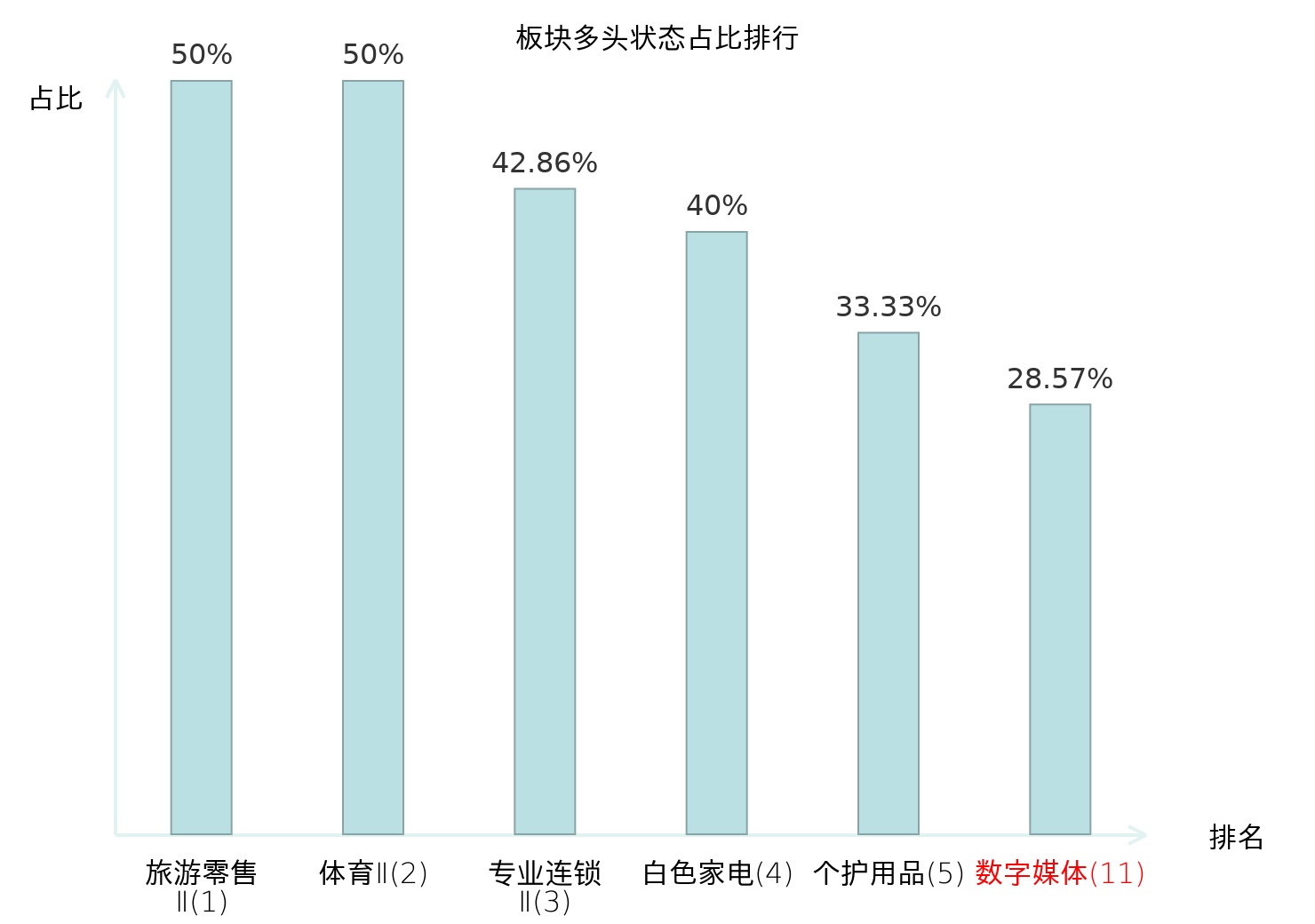 全市场所有行业板块中主力多头状态占比排名中,旅游零售Ⅱ板块位居第一。化学原料板块名次提升最快,较昨日上升35位。