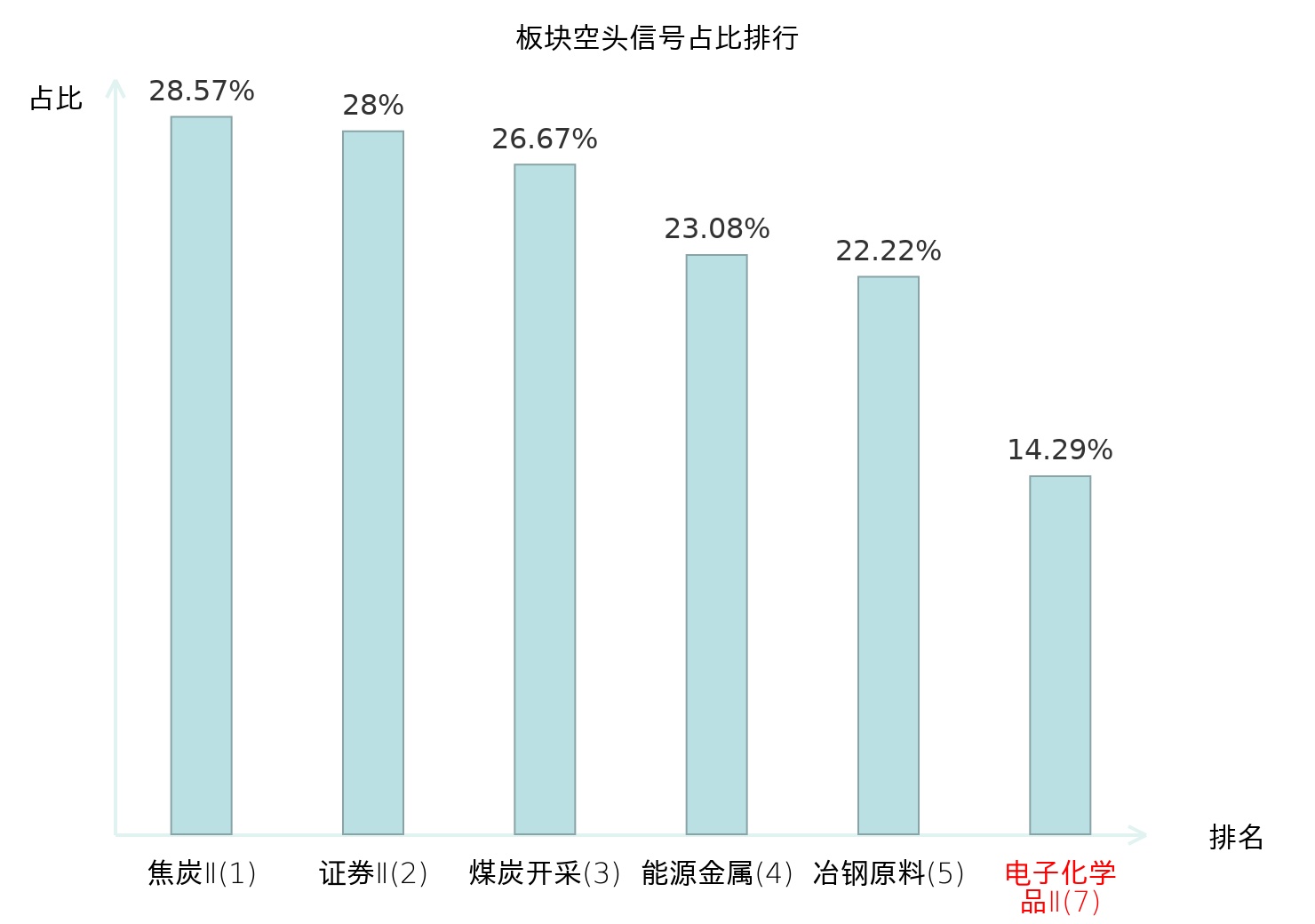 全市场所有行业板块中主力空头信号占比排名中,焦炭Ⅱ板块位居第一。煤炭开采板块名次提升最快,较昨日上升128位。