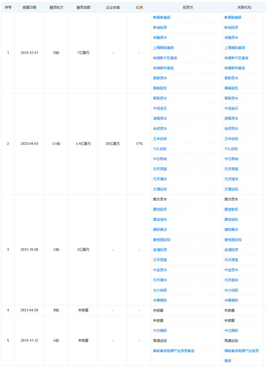 具体来看,该公司2015年11月的A轮融资投资方包括中芯国际、高通创投、国家集成电路产业投资基金。随后于2021年、2023年发生的C轮和C+轮融资金额分别为3亿美元、3.4亿美元,并且引入了厚望系和中金系股东。
