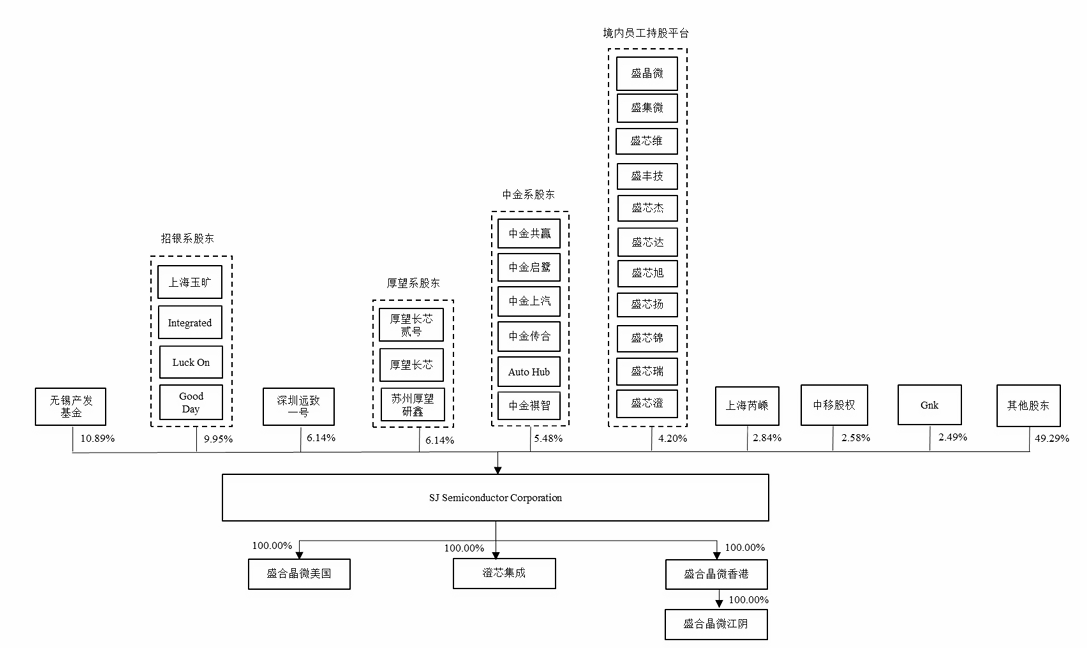 股权结构方面,截至招股说明书签署日,盛合晶微前五大股东分别为无锡产发基金、招银系股东、深圳远致一号、厚望系股东、中金系股东,持股比例分别为10.89%、9.95%、6.14%、6.14%、5.48%。
