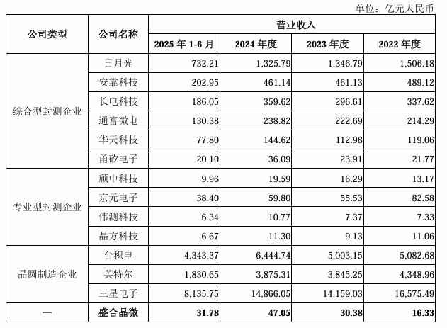 综合型封测企业中,盛合晶微将日月光、安靠科技、长电科技、通富微电、华天科技、甬矽电子作为可对比公司;专业型封测企业中,其可对比公司为颀中科技、京元电子、伟测科技、晶方科技;晶圆制造企业中,其可对比公司为台积电、英特尔、三星电子。