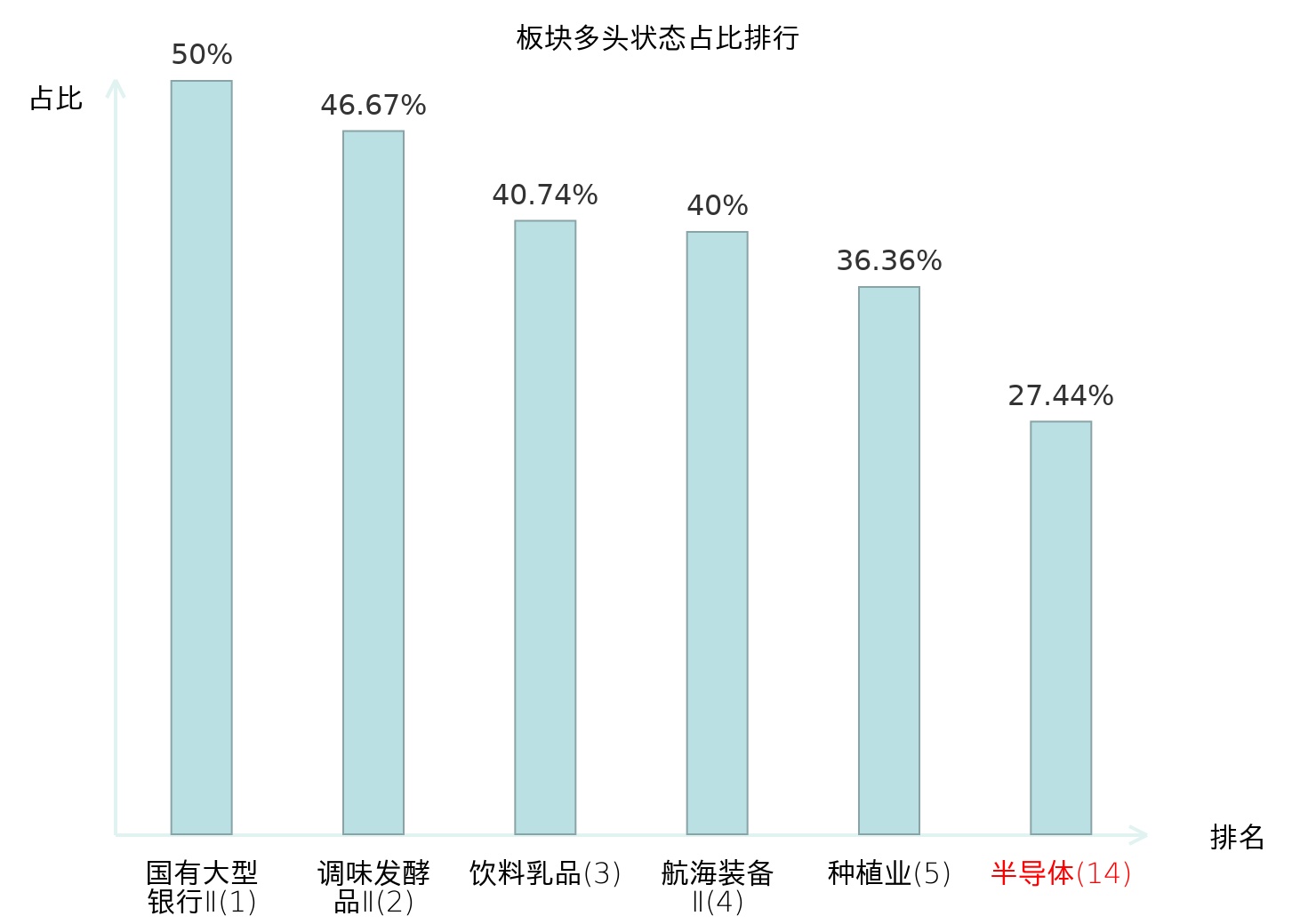 全市场所有行业板块中主力多头状态占比排名中,国有大型银行Ⅱ板块位居第一。金属新材料板块名次提升最快,较昨日上升71位。