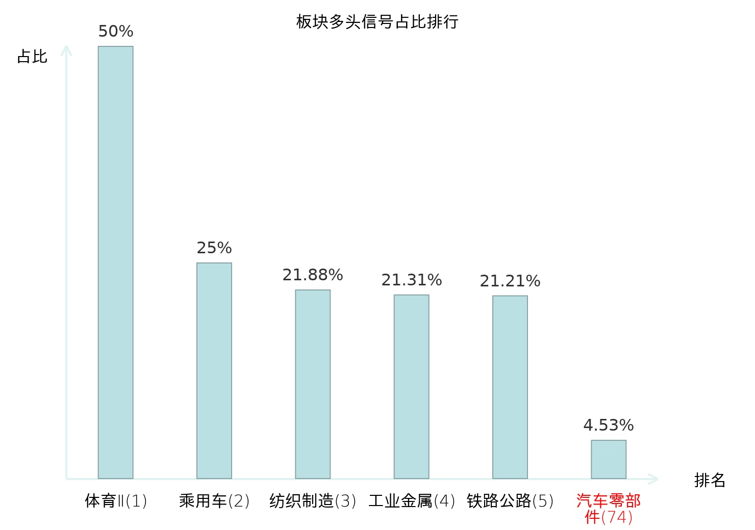 全市场所有行业板块中主力多头信号占比排名中,体育Ⅱ板块位居第一。体育Ⅱ板块名次提升最快,较昨日上升130位。