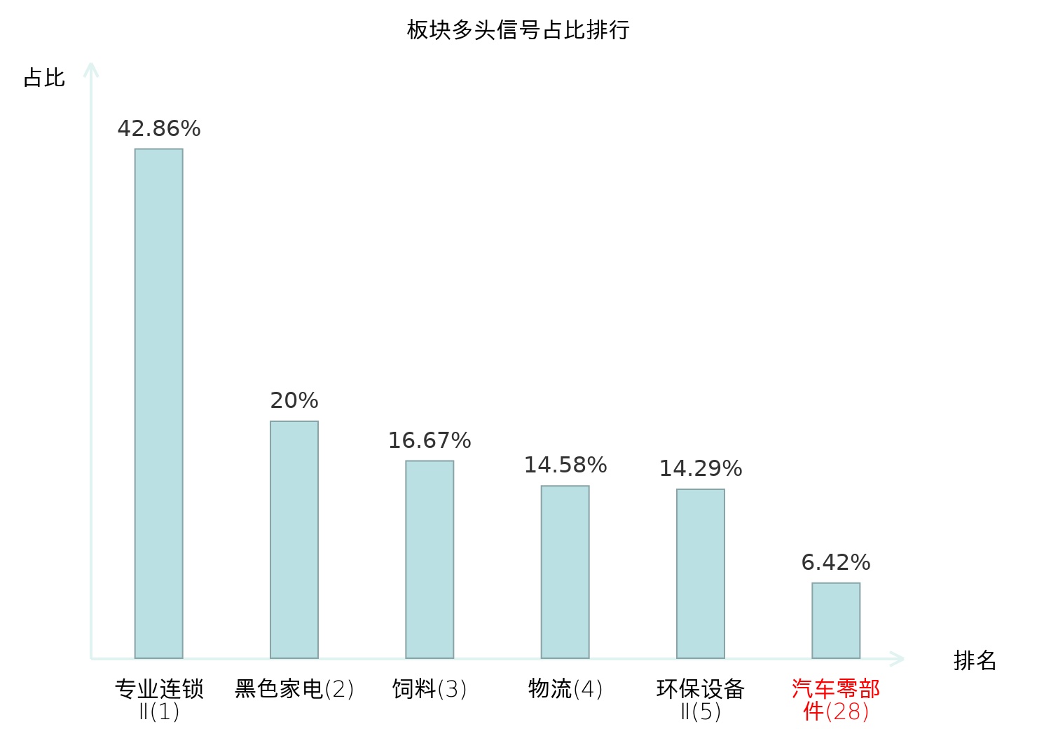 全市场所有行业板块中主力多头信号占比排名中,专业连锁Ⅱ板块位居第一。专业连锁Ⅱ板块名次提升最快,较昨日上升122位。