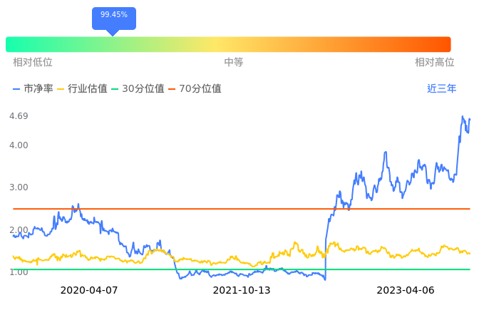 ST花王当前市净率PB为4.59,在所属的基础建设中,市净率PB排46,前五名分别为东方园林市净率0.59、中国铁建市净率0.59、隧道股份市净率0.72、腾达建设市净率0.73、中国中铁市净率0.76。ST花王当前市净率PB为4.52,超过近3年99.45%的历史数据。