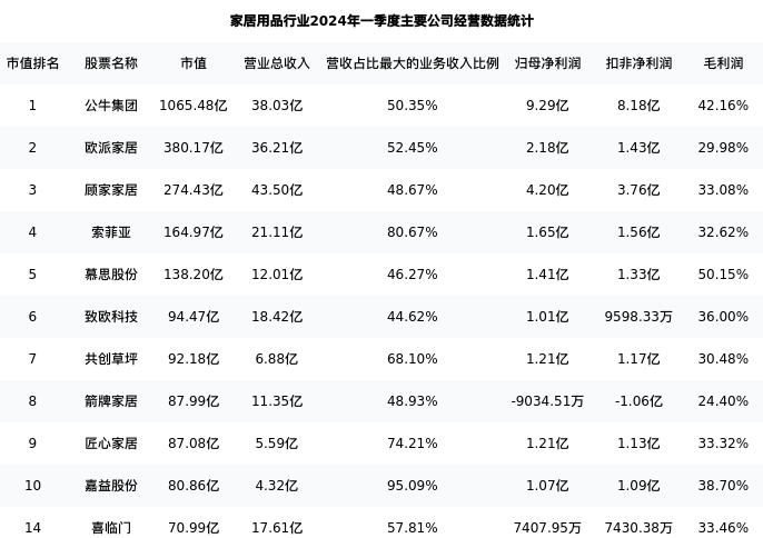 喜临门最新报告期数据为一季度,下表汇总了家居用品行业内市值靠前的公司一季度主要经营数据