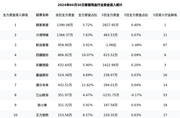 从主力资金流向来看,家居用品行业今日主力资金流入8.65亿元,在所有申万二级行业中排名:111/131。