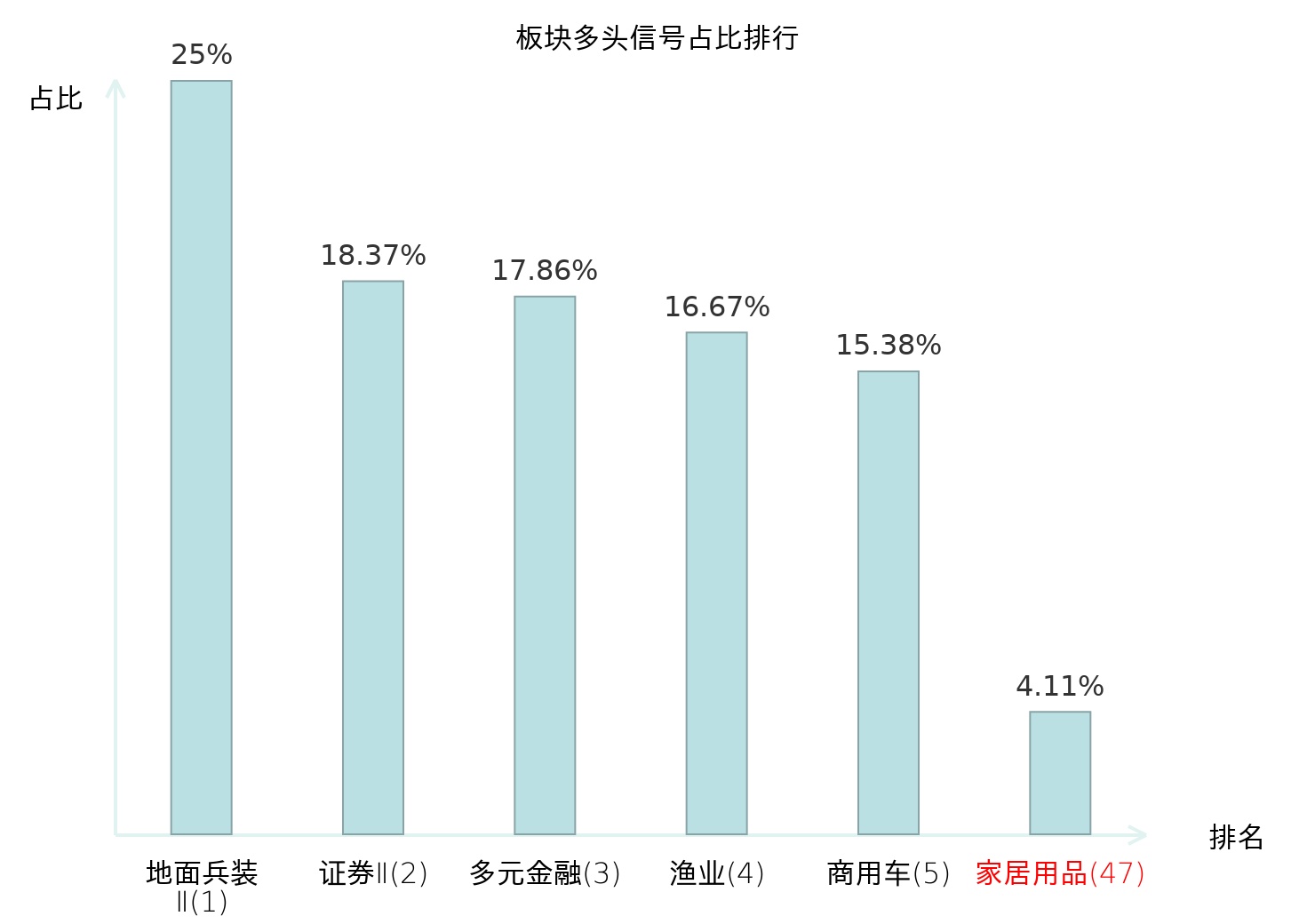 全市场所有行业板块中主力多头信号占比排名中,地面兵装Ⅱ板块位居第一。渔业板块名次提升最快,较昨日上升119位。