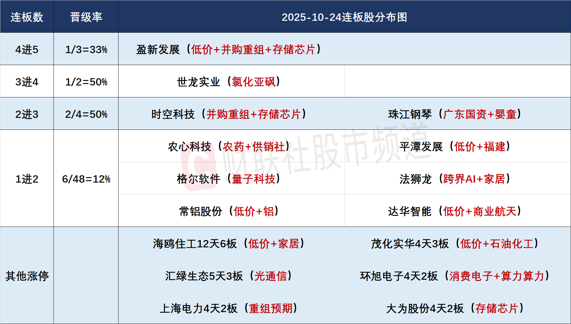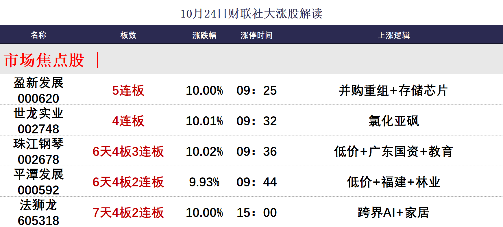 财联社10月24日讯,今日57股涨停,20股炸板,封板率为74%,盈新发展5连板,世龙实业4连板,珠江钢琴平潭发展6天4板,法狮龙7天4板,海鸥住工12天6板。市场全天震荡反弹,沪指刷新年内新高,创业板指领涨。沪深两市成交额1.97万亿,较上一个交易日放量3303亿。板块方面,存储芯片、CPO、半导体等板块涨幅居前,煤炭、油气等板块跌幅居前。截至收盘,沪指涨0.71%,深成指涨2.02%,创业板指涨3.57%。