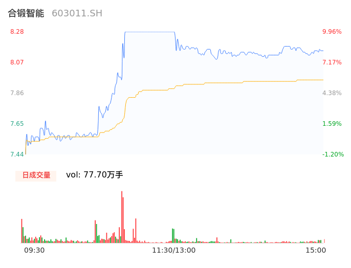 04月29日,合锻智能收报8.16,股价涨幅8.37%,成交金额6.18亿元,换手率15.72%。