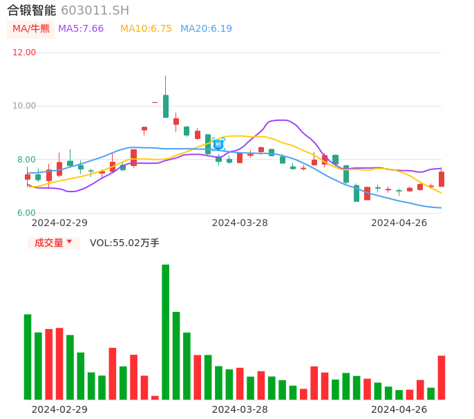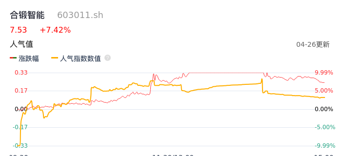 04月26日,合锻智能收报7.53,股价涨幅7.42%,成交金额4.12亿元,换手率11.13%。