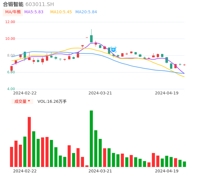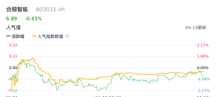04月19日,合锻智能收报6.89,股价涨幅-0.43%,成交金额1.11亿元,换手率3.29%。