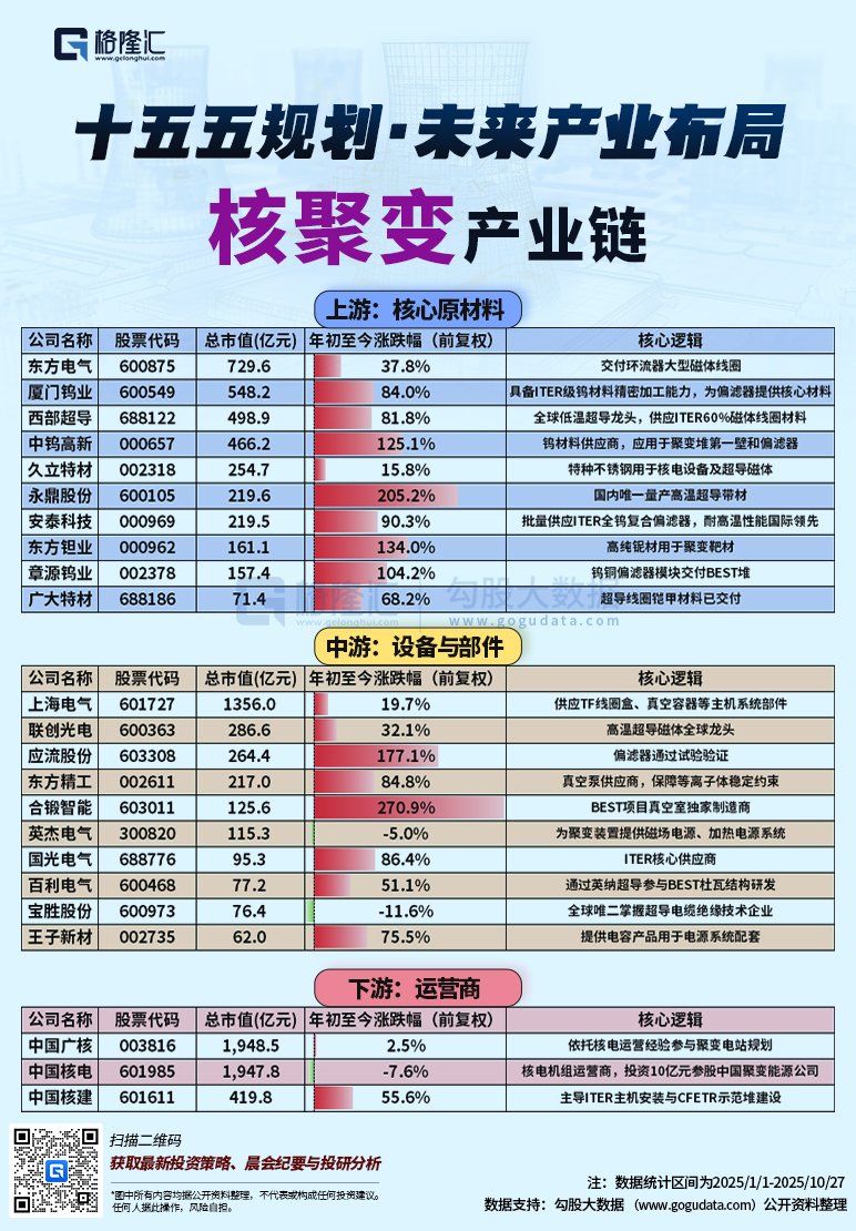 此外,中金公司研报表示,十五五规划将可控核聚变明确纳入国家未来产业体系,标志着其从前沿科学探索正式升级为战略性科技攻关方向。其作为清洁基荷能源,不仅能支撑高耗能产业降碳升级,还可衍生多领域应用,当前产业链上中下游协同突破,核心材料、关键设备与集成设计环节技术成熟度持续提升,为商业化奠定基础。建议重点关注超导线缆、激光器、传感监测与控制系统等上下游产业链投资机会。